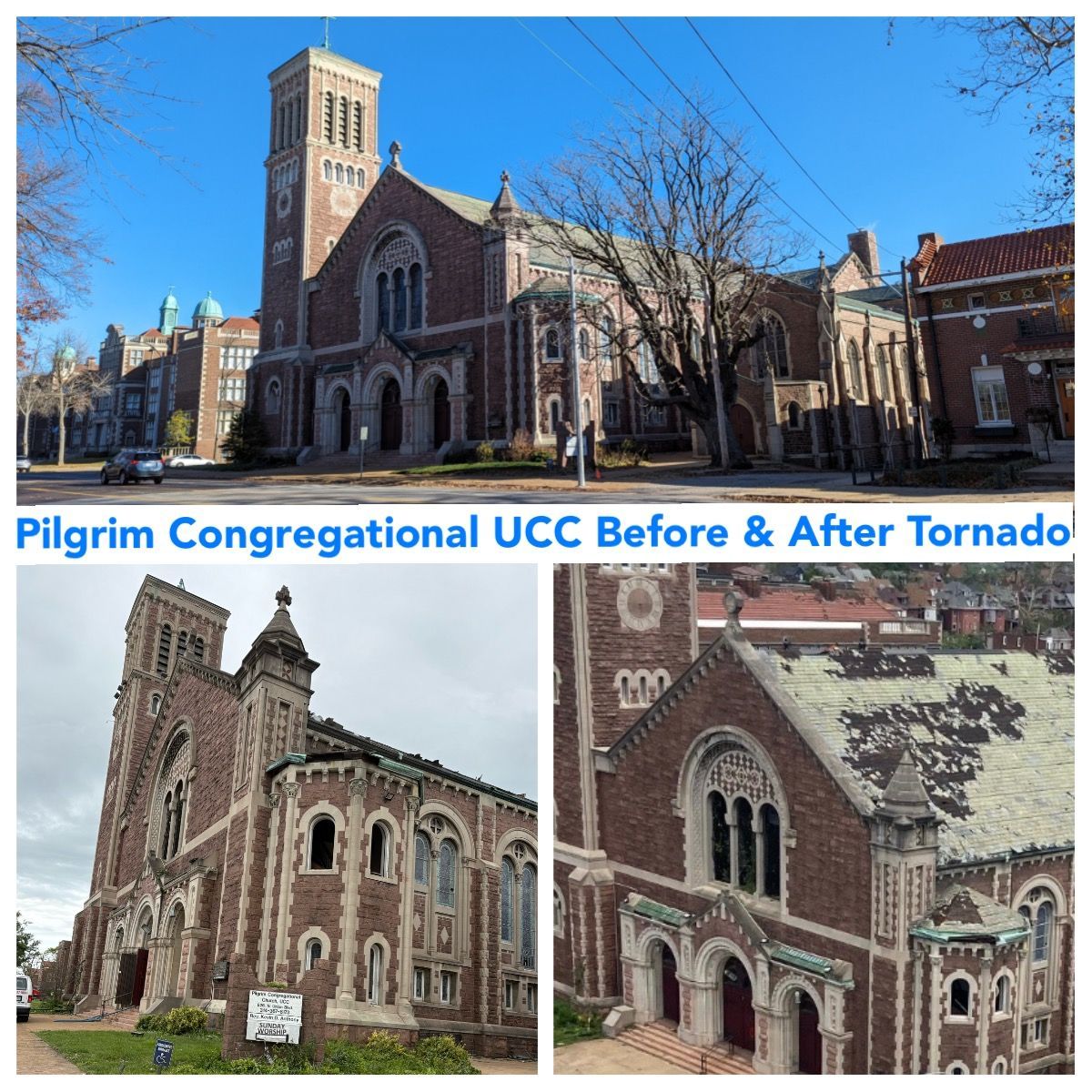 These photos demonstrate some of the roof and other damage we have experienced at Pilgrim Congregational UCC. When our power is restored and we have our facility protected from further damage, we will continue to strengthen our partnerships with our sister churches (Union Avenue Christian Church and Centennial Christian Church) and Academy of Sherman Park Neighborhood Association to support the emergency response and ongoing recovery efforts for our neighborhood and others impacted by the storms.